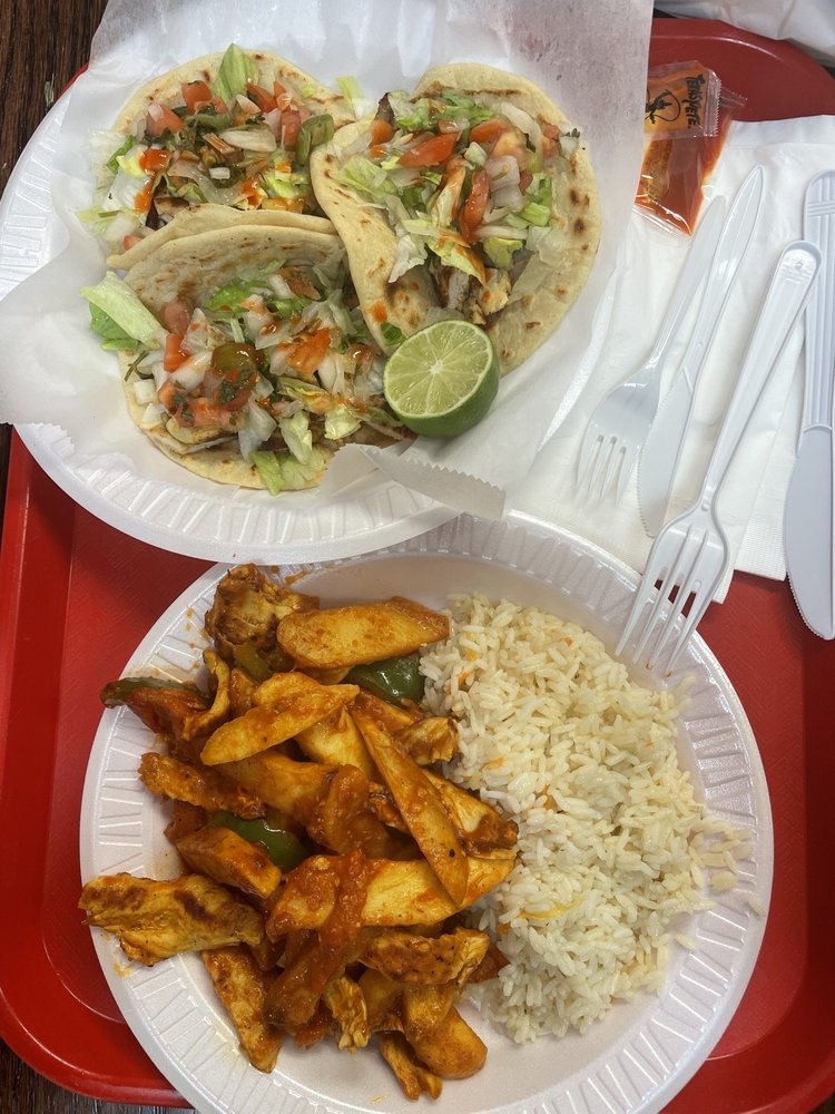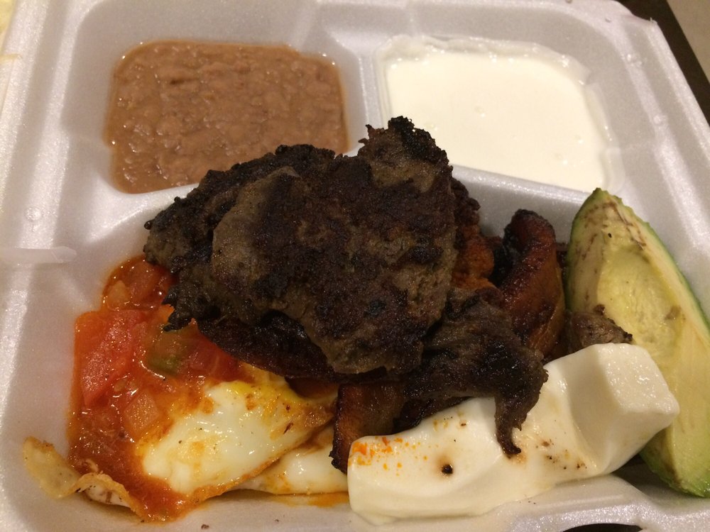 Grilled skirt steak, served with 2 tortillas, rice, beans and side salad