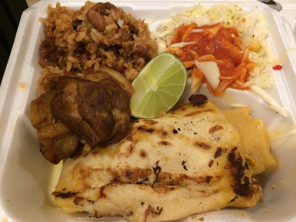 Salvadorian tortilla filled with: cheese, cheese and beans, cheese and pork, cheese and loroco or cheese and squash. Served with marinated cabbage and tomato sauce. Side: Cheese, Cheese and Beans, Cheese and Loroco, Cheese and Pork, Cheese and Squash